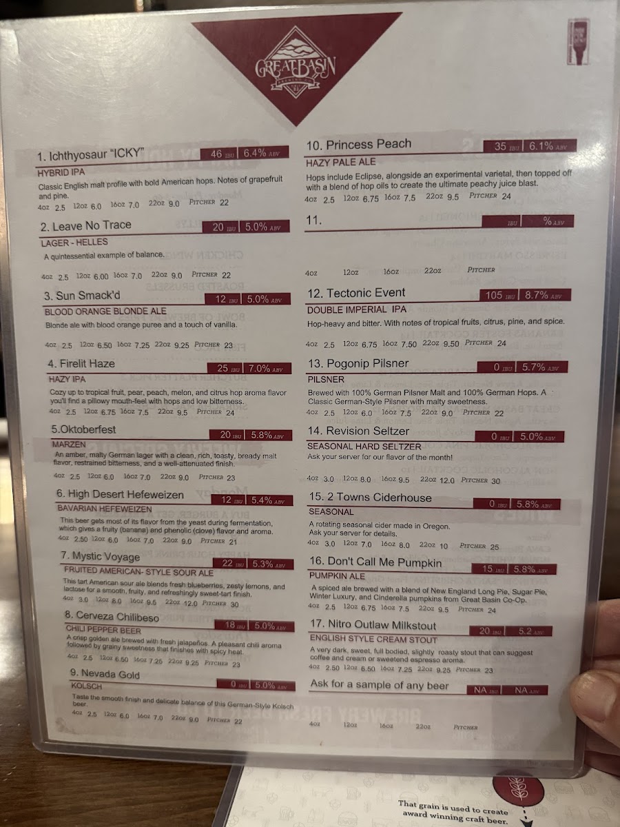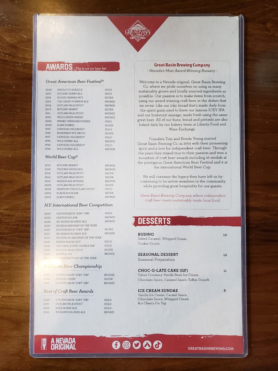 The brewpub specializes in a variety of cuisine styles that reflect classic American fare with a gourmet twist. Among the highlights of their menu, the Ichthyosaur Icky IPA stands out, a tribute to Nevada's official state fossil. This classic American IPA presents a delightful balance of piney and citrus hops alongside a robust malt backbone, making it a must-try for beer enthusiasts. Other notable offerings include the refreshing Leave No Trace Alpine Lager, perfect for outdoor adventures, and the Sun Smack’d Fruited Blond Ale, which captures the essence of summer with hints of orange and vanilla.